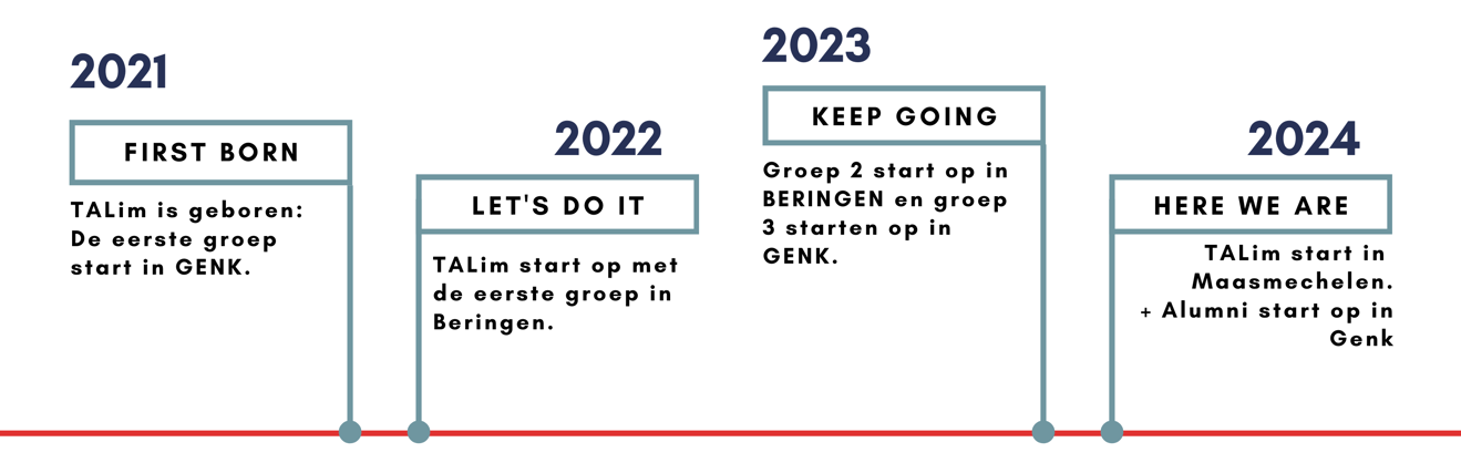 TALim startte in 2021 als een pilootproject om de schooluitval in Limburg aan te pakken. Als eerste locatie kozen we voor tieners die in Genk wonen of er naar school gaan. Na het eerste succesvolle jaar werd in 2022 een tweede jaar opgericht en konden we uitbreiden naar Beringen om daar een eerste jaar te starten. In 2023 kwam er op beide locaties nog een groep bij en kijken we in 2024 uit naar onze eerste afgestudeerden in Genk, het derde jaar in Beringen en een uitbreiding naar Maasmechelen.